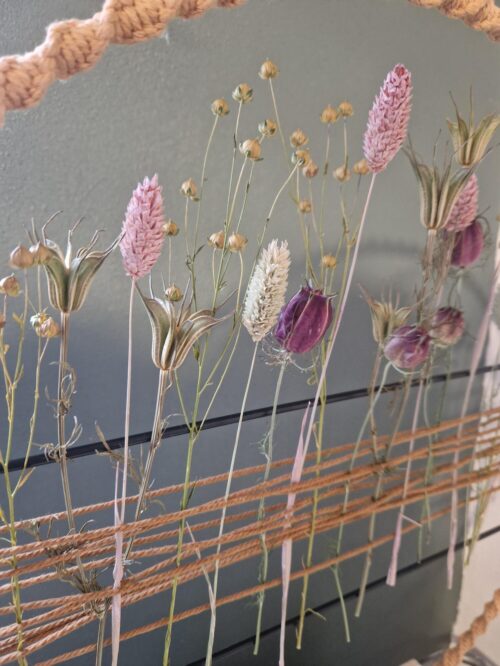 Tijdens de workshop leer je stap voor stap de knopen van macramé. De ring wordt geknoopt en in het midden van de ring steken we verschillende droogbloemen tussen touw. Dit geeft een erg leuk effect. Ik heb verschillende kleuren touw waar je uit kunt kiezen. Je maakt de ring in de kleur die bij je past.